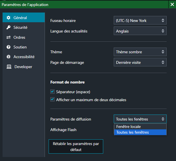 Les paramètres de diffusion peuvent être mis à jour, avec la possibilité de basculer entre Fenêtre locale et Toutes les fenêtres.