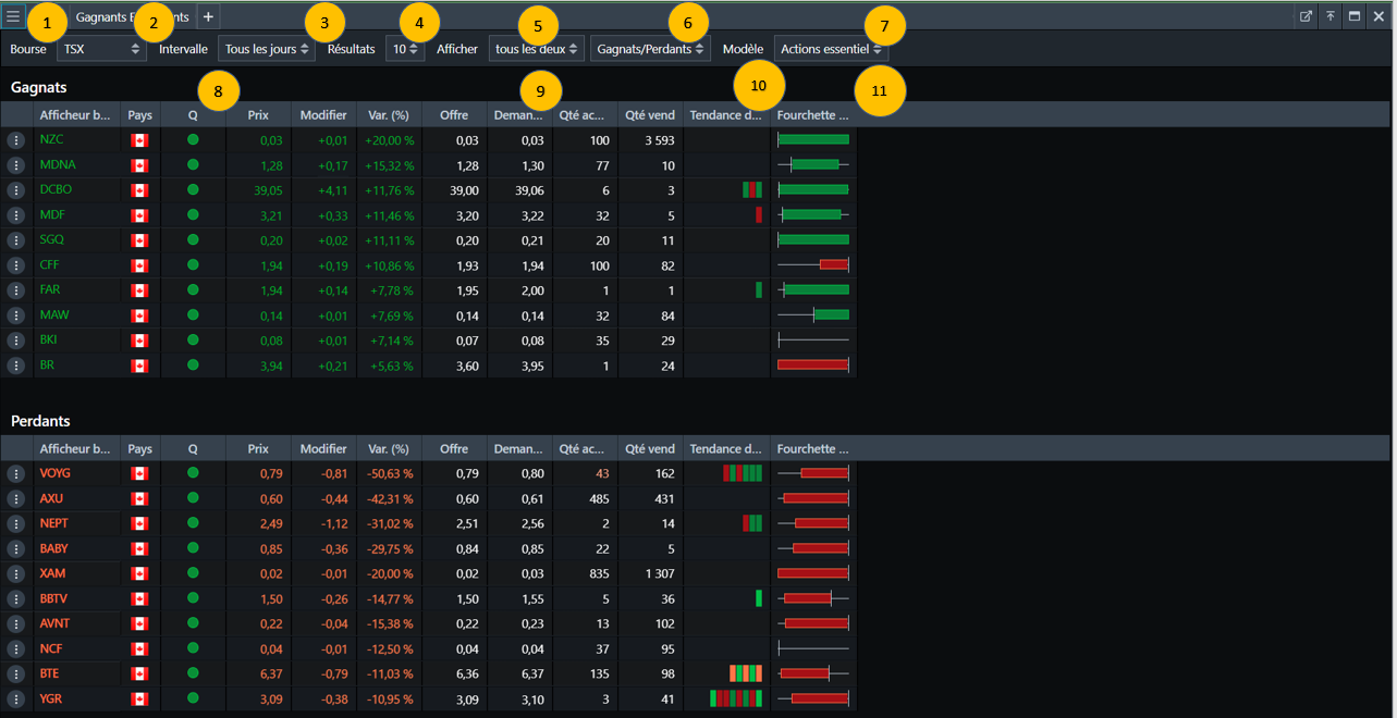 Titres les moins et les plus performants La composante Titres les moins et les plus performants indique les actions qui ont le plus progressé ou reculé (variation en pourcentage du cours) sur les marchés canadien et américain.