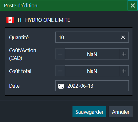 Le Coût total sera rempli automatiquement en fonction de la Quantité et du Coût/part. Après avoir choisi une date, mettez à jour votre position pour ce titre.