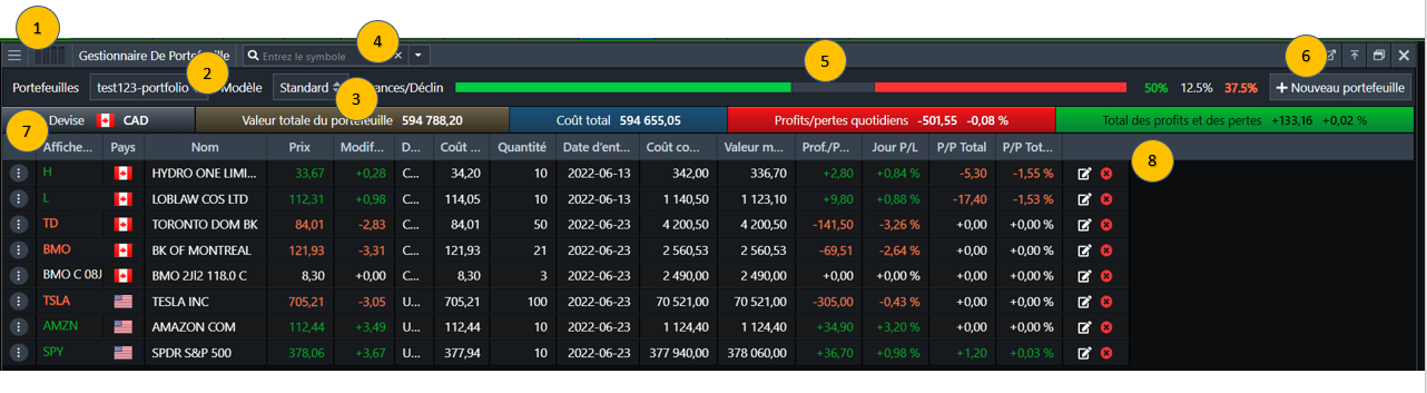 La composante Gestionnaire de portefeuille vous permet de suivre le rendement de votre portefeuille et d’ajuster votre position au besoin pour tester vos idées de négociation.