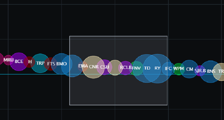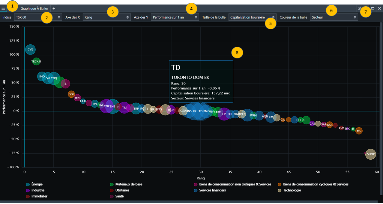 La composante Graphique à bulles fournit une comparaison visuelle des sociétés prédominantes sur le marché à l’aide de données en temps réel pour faciliter l’analyse et le repérage des tendances générales. Faites défiler pour faire un zoom avant et arrière. Vous pouvez consulter de nouveau l’affichage par défaut en cliquant sur le bouton Réinitialiser le zoom.