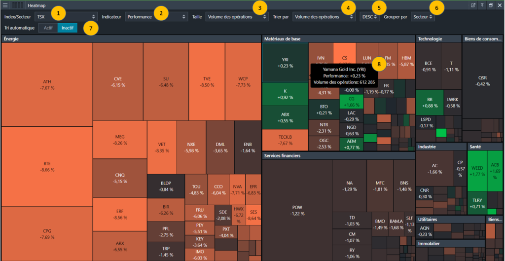Carte de densité de clics La composante Carte de densité de clics offre une représentation visuelle des marchés, notamment des indices, des secteurs et de divers titres qui attirent l’attention des investisseurs.