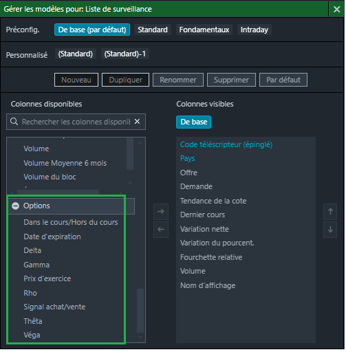 Dans le menu du widget, cliquez sur Gérer les modèles et sélectionnez le modèle que vous souhaitez mettre à jour. Dans les colonnes disponibles, naviguez jusqu’à la section Options et sélectionnez les variables grecques et/ou le champ « Dans le cours/Hors du cours » que vous souhaitez ajouter à votre modèle.