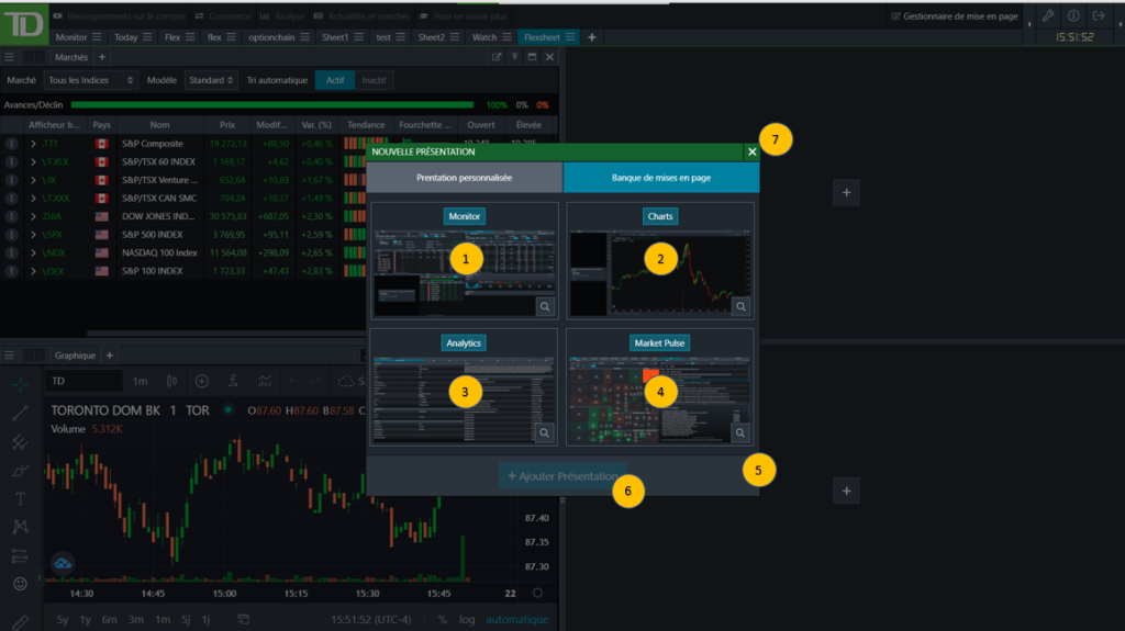 Ces mises en page sont prédéfinies par la TD. Vous pouvez accéder à la Banque de mises en page de l’une des deux façons suivantes : en cliquant sur le bouton Gestionnaire de mise en page situé dans le coin supérieur droit de la fenêtre ou en cliquant sur le bouton plus situé à côté des onglets de l’espace de travail, puis en sélectionnant l’onglet Banque de mises en page.