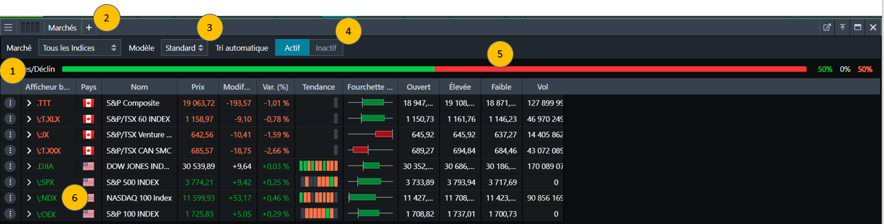 Marchés La composante Marchés présente des données en temps réel sur les principaux indices et indices sectoriels du Canada et des États-Unis.