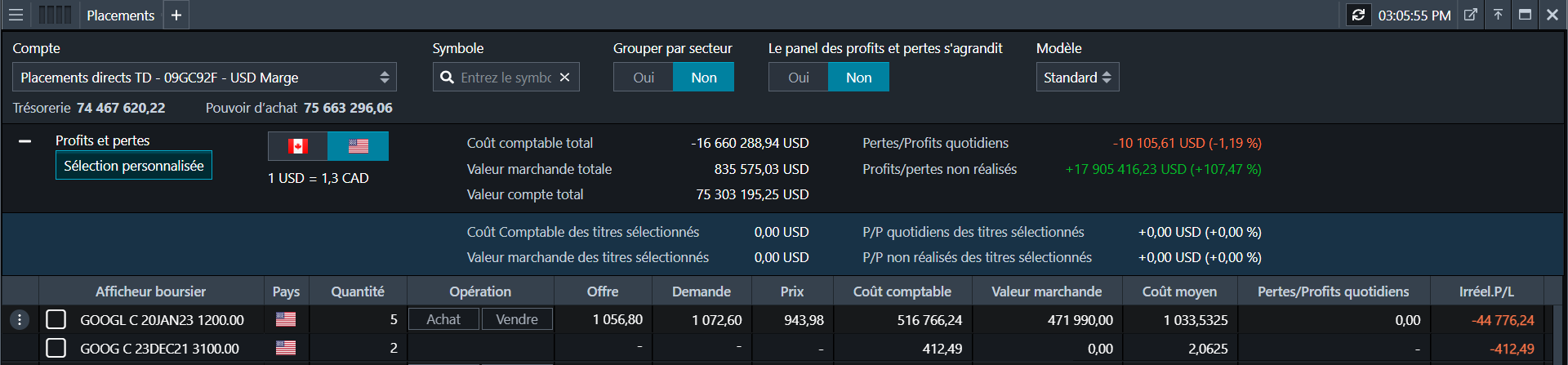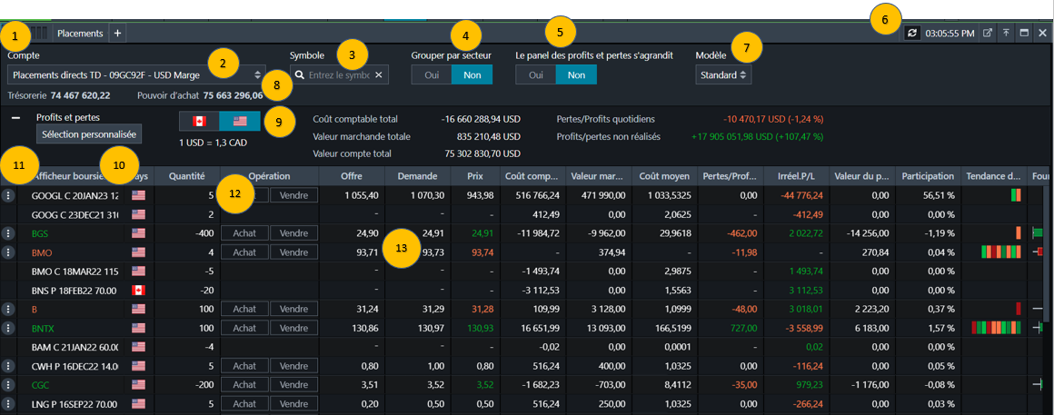 Affichez vos placements en continu en temps réel, comme les Liquidités, le Pouvoir d’achat et les Profits et pertes.