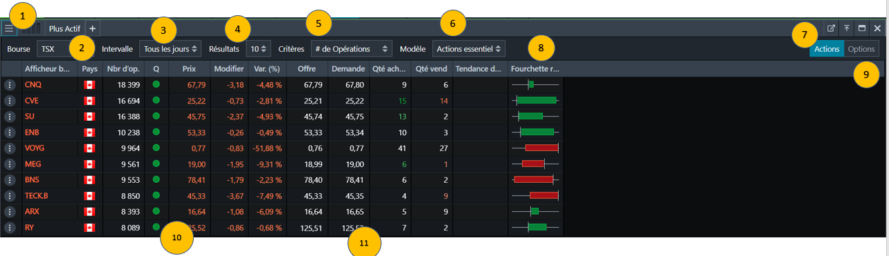 Plus actif La composante Plus actif présente les actions et les options ayant le plus haut volume de négociation dans les marchés canadiens et américains.